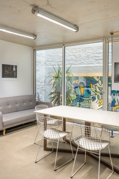 La façade arrière a été entièrement repensée sous la forme d’un grand mur rideau vitré, ouvrant généreusement les espaces de travail sur un patio recréé à l’arrière du bâtiment.