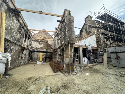 En amont du projet, l’agence a réalisé un relevé complet des bâtiments sinistrés, permettant d’établir un diagnostic précis et un chiffrage détaillé dans le cadre de l’expertise d’assurance. Ce travail a constitué une base essentielle pour définir les orientations de reconstruction et garantir la cohérence des interventions.