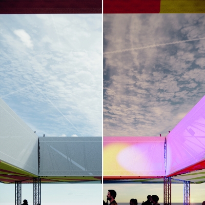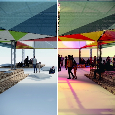 À la nuit tombée, l’installation se transforme. Intégré dans la structure, un dispositif de lumière et d’enceintes vient activer l’espace pour lui donner une nouvelle dimension : un lieu de fête, de musique et de rencontre, où l’on peut aussi bien s’asseoir, danser ou simplement rêver sous la structure.