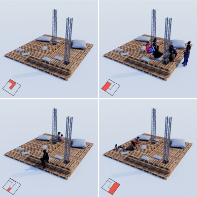 L’aspect durable repose sur un principe simple : utiliser uniquement des éléments déjà présents sur le site du festival: structures de scène, palettes, bâches et textiles réemployés. Pensé comme un assemblage réversible, le dispositif peut être monté, démonté puis réinstallé ailleurs ou lors d’une prochaine édition, sans nécessiter de nouveaux matériaux. Une architecture éphémère, légère et adaptable, à l’image du festival lui-même.