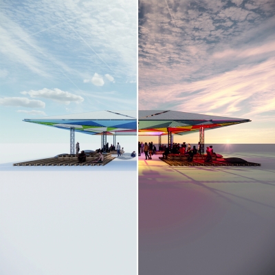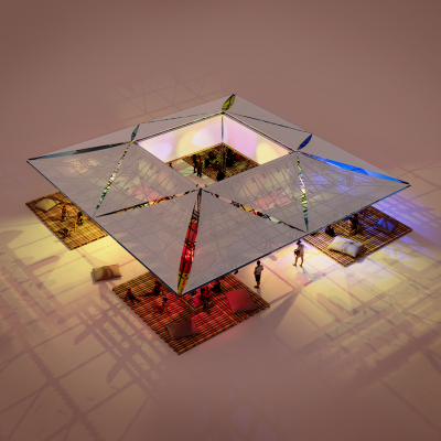 À la nuit tombée, l’installation se transforme. Intégré dans la structure, un dispositif de lumière et d’enceintes vient activer l’espace pour lui donner une nouvelle dimension : un lieu de fête, de musique et de rencontre, où l’on peut aussi bien s’asseoir, danser ou simplement rêver sous la structure.